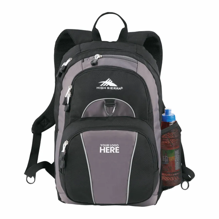 The High Sierra Enzo Backpack is a multi-compartment backpack that features two large main compartments and an organizer compartment with pen pockets. Top zippered accessory pocket are also offered with a headphone port. Large gusseted side mesh beverage pocket. Comfort is provided by S-shaped padded shoulder straps, a padded back panel and a heavy duty webbing grab handle. Signature High Sierra hardware. Includes lifetime warranty.