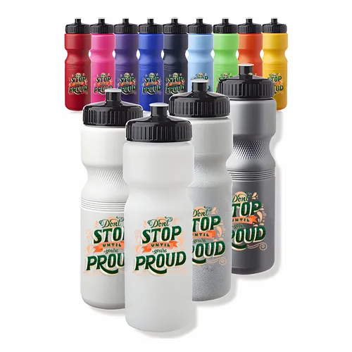 This 28 oz Hydro Mate Easy Push Cap Water Bottles is made of durable, high-density colored polyethylene material and has a good grip action bottle with a ridged cap. The easy-flow colored drinking push cap makes it easy to take a sip, even when you're on the go. The caps do not come assembled on the bottles, so you can customize them with your own logo or design. Order yours today and stay hydrated in style with this amazing drinkware!!