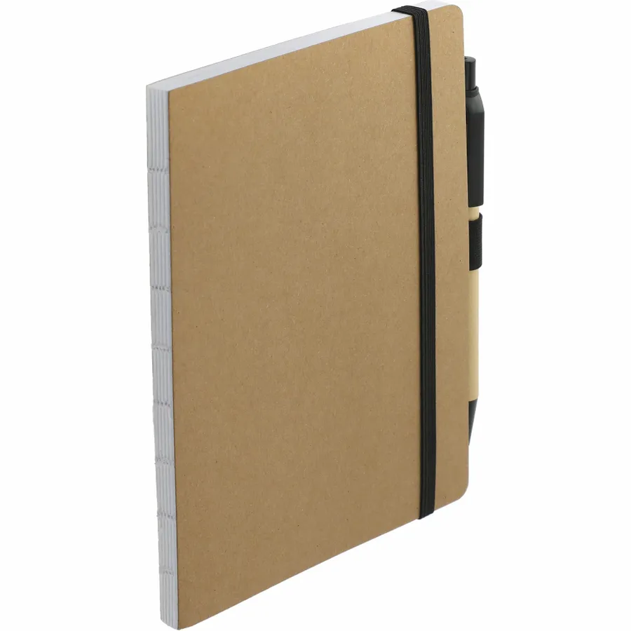The 5 x 7 FSC Recycled Notebook and Pen Set features a FSC recycled hard cover with exposed stitched spine, black elastic closure and pen loop. Includes 80 sheets of FSC recycled white lined paper and matching FSC recycled paper barrel pen with black ink cartridge. Through a partnership with 1% For The Planet, one percent of sales of all EcoSmart products are donated to environmental nonprofits. Note that pens are packed separately.