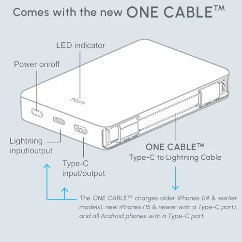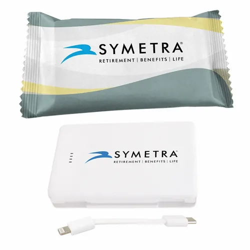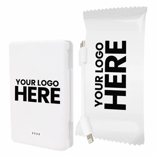 Keep business teams powered up with this officially UL-listed 5,000 mAh power bank in a candy wrapper that comes with a built-in storage section for a short Type-C to Lightning cable. The attached cable works with Android and Apple phones, PLUS, recharges the power bank. Having a cable always nearby will help keep teams efficient while speeding through a productive day. The innovative ONE CABLE™ solution charges old iPhones (14 and earlier models), new iPhones (15 and newer with a Type-C port)