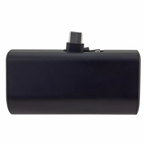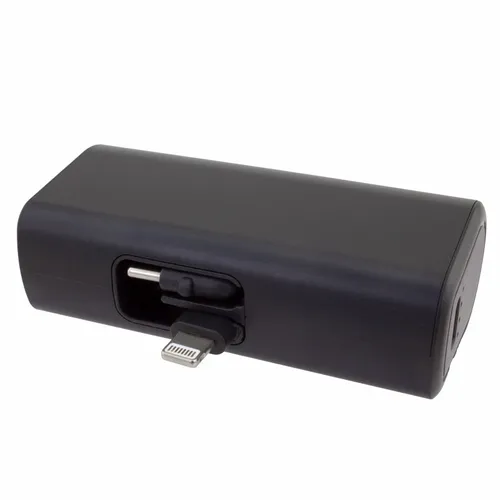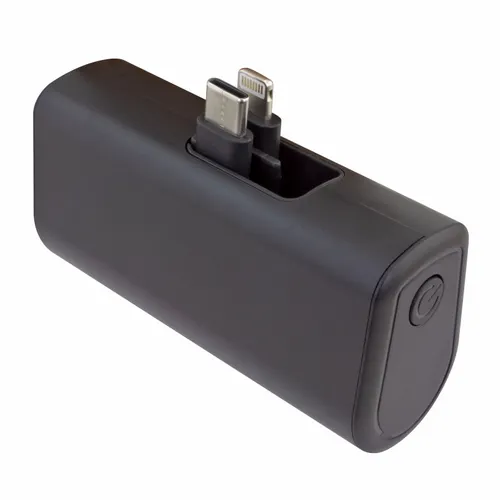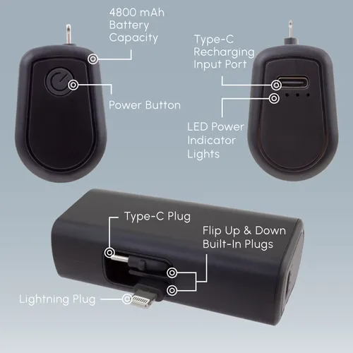 A dual charging power bank with built-in Lightning and Type-C plugs that can be flipped down when not in use. It is easy to attach to a phone and use throughout a workday while on business trips or during vacation travel.