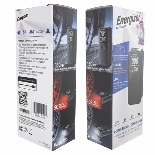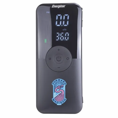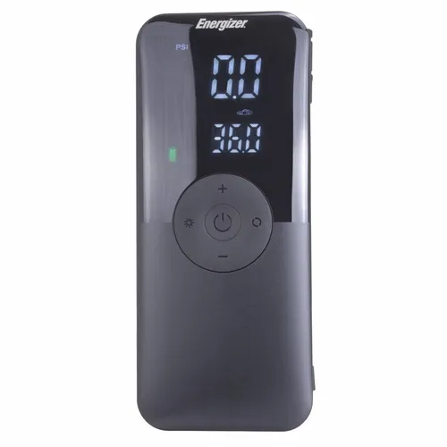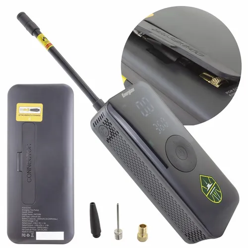 A portable and rechargeable electric tire pump with a large easy-to-view LCD display. It has five inflation modes: automotive, motorcycle, and bicycle tires as well as a setting for sports balls. It also functions as a power bank with a USB output port located on top. Recharge the air pump's built-in lithium battery via its Type-C input port. It is packaged with a compact attachable air hose and a Type-C cable. AC wall adapter not included.
