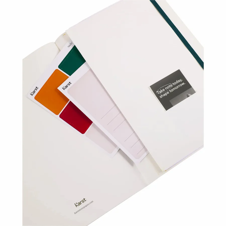 The Karst Pro Series Notebook is designed to keep you organized and focused, providing ample space for brainstorming, planning, and organizing your work. Featuring durable, waterproof, and tear-proof stone paper, this notebook includes 144 pages that are ideal for daily notes, key objectives, and important dates. Thoughtful design elements like colored stickers, index pages, and an expandable back pocket help you keep track of critical notes with ease. The double ribbon page markers and lay-flat thread binding enhance usability, making this notebook a reliable companion.