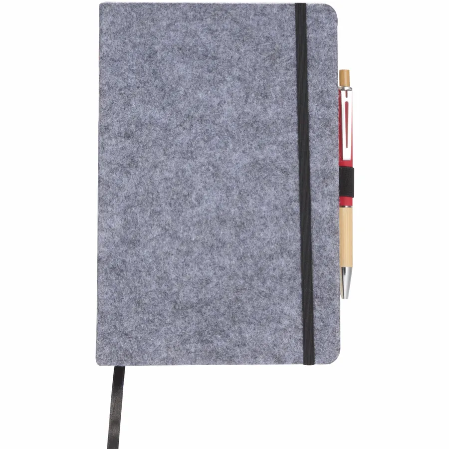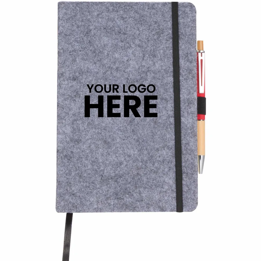 THE GOODS™ recycled felt collection uses a durable on-trend material to let your brand shine. THE GOODS™ 8 x 5.5 Recycled Felt Bound Notebook features an eco-friendly, 100% recycled PET felt fabric cover. Includes 80 sheets of recycled cream lined paper, back document pocket, ribbon page marker, elastic closure, and pen loop. Pen is not included. By choosing this notebook, youre making a positive impact on the environment, as one percent of sales are donated to environmental nonprofits through a partnership with 1% For The Planet.