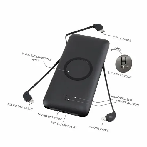 Simplify your Smart Simplify your Smart Phone charging experience with the Chi-Charge Plus. Have a wireless charging phone? Place it on the Chi-Charge Plus to power up! Still charging using wires? No problem! All major cables are built right in: 8-Pin Compatible, micro USB, and Type-C. When time to recharge the Chi-Charge Plus, simply plug it directly into your wall via the integrated AC Plug. With the Chi-Charge Plus 5000 mAh Power Bank, it will be easier than ever to stay charged.